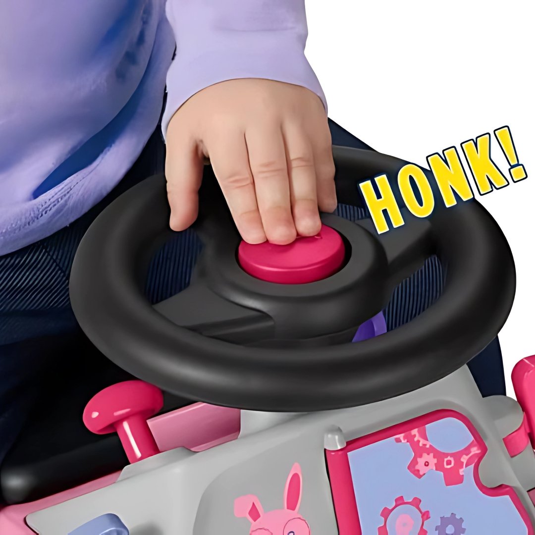 The ergonomic seat provides comfort for toddlers, while the sturdy backrest doubles as a supportive handle for beginners learning to walk. The interactive gear panel with colorful moving gears stimulates curiosity and hand-eye coordination, keeping kids entertained while they explore. The easy-to-grip steering wheel allows children to practice directional movement, enhancing their sense of control and coordination.